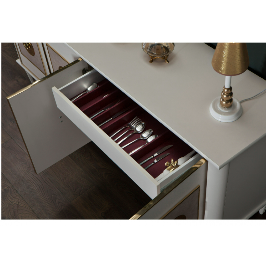 Широкий буфет для посуды Мистраль в современном стиле прованс от турецкой фабрики Bellona придаст дополнительного одобрения за вместительность и функциональность. Снаружи прилавок выполнен в сочетании молочного цвета и серой имитации горизонтальных досок, с декоративной отделкой цвета орех. Внутри в широком отделении выдвижной ящик с разделителями для столовых приборов, в узких отделениях- полка.