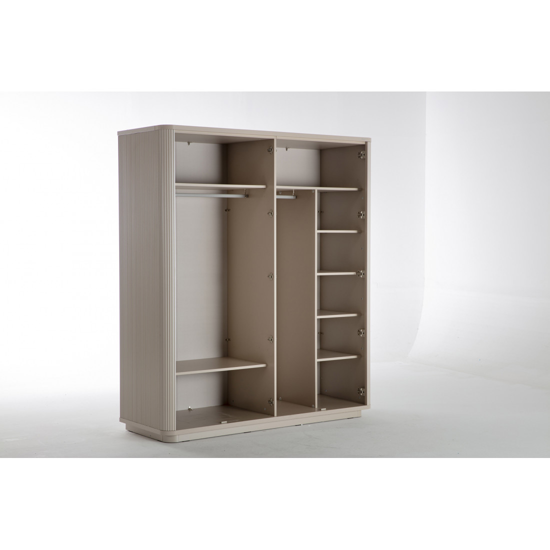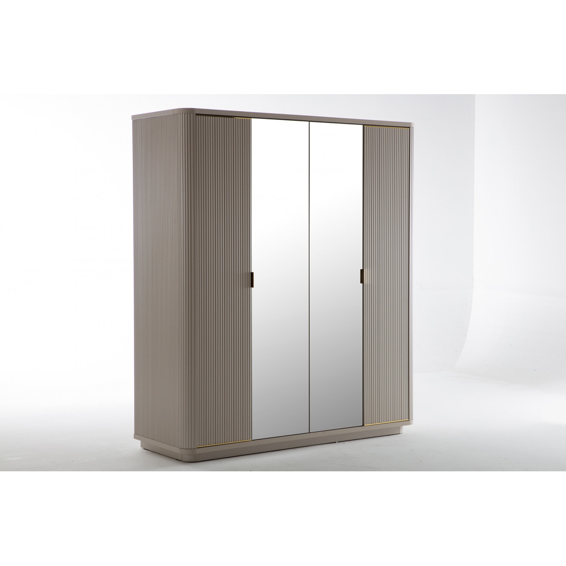Четырехдверный шкаф Санвито SANV-20 один из вариантов шкафов, представленных турецким брендом Bellona в коллекции SANVITO. Благодаря своей длине 1810 мм, он отлично впишется в небольшую спальню. Наполнение же шкафа ,при глубине 660мм, позволит хранить все необходимые вещи для гардероба. В шкафу предусмотрены как полки для белья, так и штанги для вещей. Максимум хранения при минимальных габаритах. Отдельно стоит уделить внимание дизайну шкафчика. Первое, что обращает на себя внимание это округленная форма шкафа, отсутствиеострых углов. Шкафчик кажется обтекаемым со всех сторон. Вертикальные рифленые полосы на фасадах наоборот создают эффект увеличения высоты. .Центральные зеркальные фасады отлично комбинируются с теплыми кремовыми тонами боковых фасадов.
