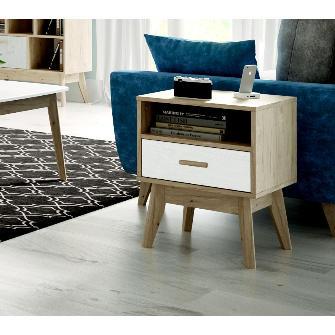 Ультратрендовая тумба Калгари от Мебельград, выполненная в светлых тонах с элементами сдержанного стиля 60-х - высокие ножки, выраженная деревянная текстура натурального дуба, четкие формы. Вся мебель очень мобильная, компактная, вызывает чуство легкости и свободного пространства, при этом она функциональна.